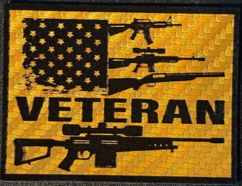 Show your pride and honor your service with this bold “Veteran” American Flag Leatherette Patch. Featuring a striking distressed American flag design creatively formed with firearm silhouettes and bold “VETERAN” lettering, this patch makes a powerful statement of strength, sacrifice, and patriotism.