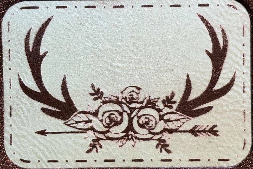 This premium leatherette patch fuses rustic wilderness charm with delicate floral elegance—perfect for adding a touch of boho-Western romance to your everyday style. The centerpiece showcases majestic deer antlers curving gracefully upward and outward, framing a lush cluster of blooming roses at the base—complete with detailed petals, leaves, and subtle foliage for a romantic, nature-inspired flourish. A sleek arrow runs horizontally beneath the flowers, complete with feather fletching and a sharp point, symbolizing direction, strength, and timeless beauty.