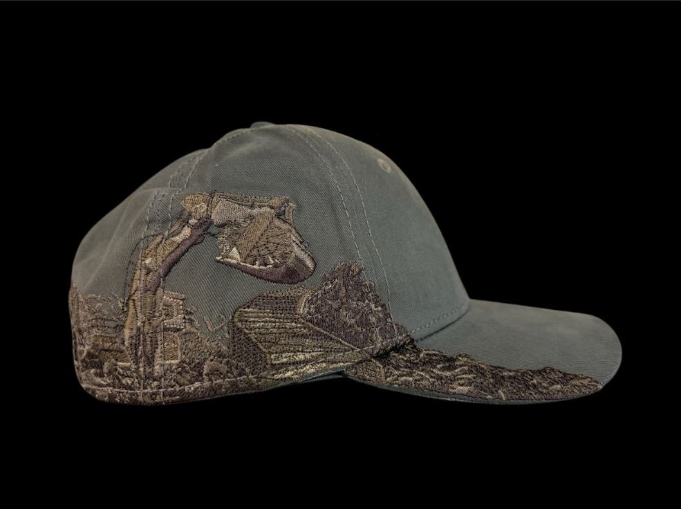 Rugged Excavator Scene Embroidered Snapback Cap – Built for the Jobsite & Beyond Dig into style with this standout embroidered baseball cap featuring a massive, detailed excavator in action—complete with a powerful bucket digging through rocky terrain and a full construction site backdrop. The intricate, multi-color embroidery wraps impressively around the side and front, blending earthy browns, deep camo-inspired textures, and industrial grit on a muted olive/gray base for that perfect rugged, worn-in look.