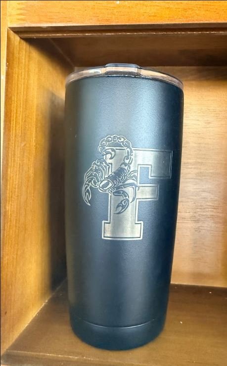 This rugged matte black insulated tumbler is perfect for showing off fierce school pride or team loyalty with a stinging edge! The eye-catching design features a precision laser-engraved scorpion wrapped around a bold capital “F”—the classic scorpion mascot logo — with detailed claws, a curled tail, and a menacing stance that exudes power and intensity. The silver engraving pops sharply against the sleek matte black powder-coated finish, giving it a premium, understated look that’s tough enough for daily use yet stylish for game days or everyday carry.