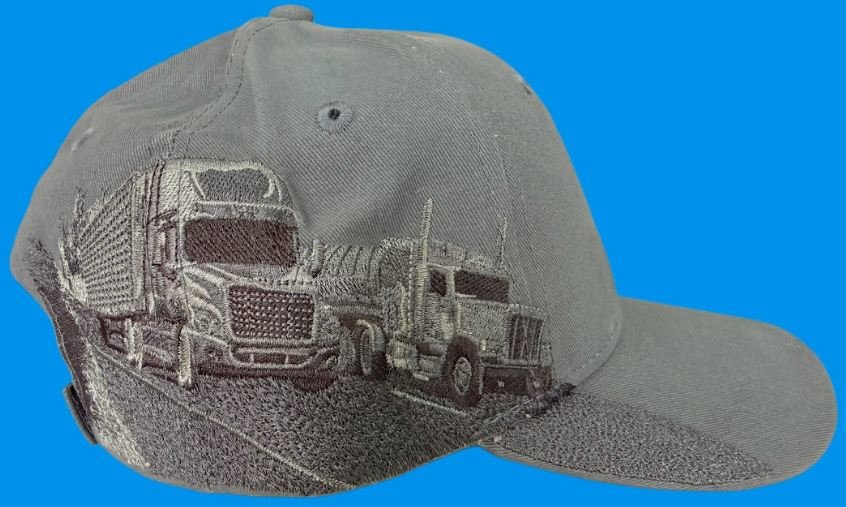 This premium embroidered trucker hat is built for the open road—honoring the kings of the highway with massive detail and rugged style that any trucker, hauler, or diesel enthusiast will love. Crafted from high-quality, garment-washed cotton/poly blend in a weathered charcoal gray (with subtle distressing for that broken-in, miles-on-the-odometer vibe), this structured six-panel cap features breathable mesh side and back panels to keep you cool on long hauls. The pre-curved bill and adjustable snapback closure make it a one-size-fits-most favorite that’s comfortable and customizable.