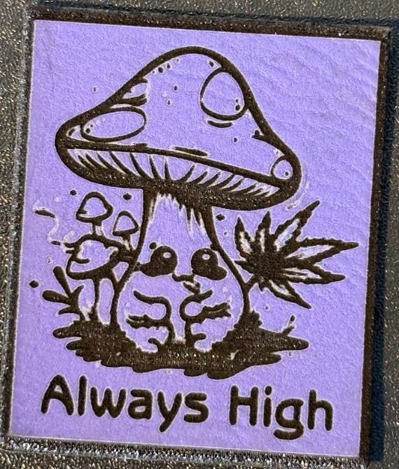“Always High” leatherette patch featuring a detailed mushroom illustration with a fun, trippy vibe, this design pops beautifully against the vibrant purple background. The rich black engraving creates a high-contrast look that’s both eye-catching and durable.