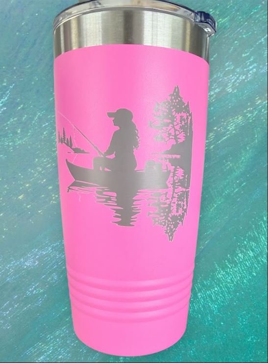 This stunning, vibrant pink insulated tumbler is made for the passionate angler who loves the serenity of the lake and the thrill of the catch! The standout feature is a beautiful precision laser-engraved silhouette of a woman sitting in a canoe, rod in hand, fishing peacefully amid tall pines and a tranquil water reflection that mirrors the entire scene—trees, boat, and angler—creating a captivating, symmetrical design that feels both artistic and adventurous. The silver-gray engraving contrasts sharply against the bold hot pink powder-coated finish for a feminine yet rugged vibe that’s impossible to miss.