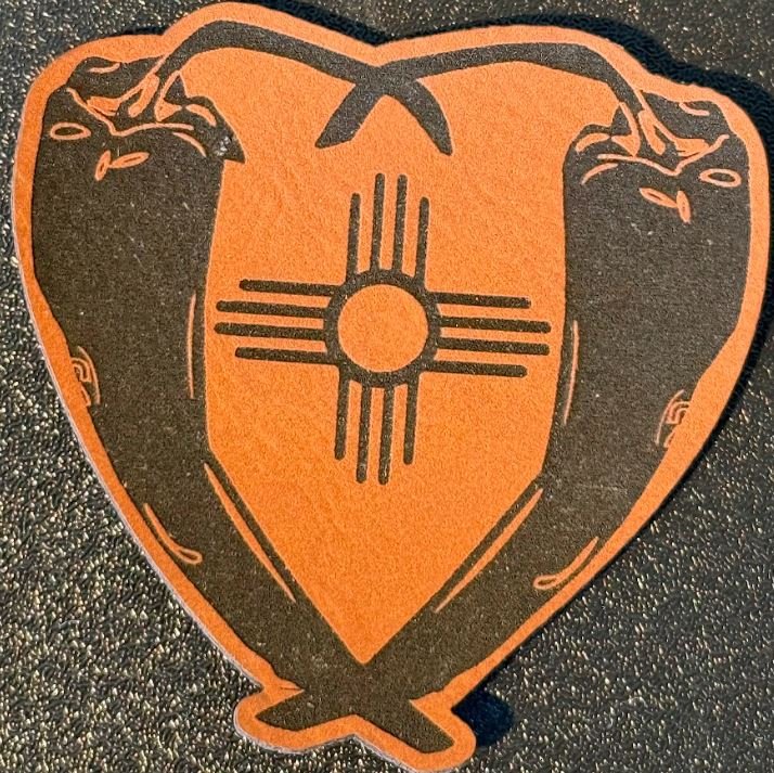 Make a bold Southwestern statement with this premium Leatherette Zia Pepper Patch. Featuring two crossed chile peppers framing the iconic Zia sun symbol, this design captures the spirit of the Southwest with a clean, rustic finish. The rich tan leatherette background paired with deep engraved detailing creates a striking contrast that stands out on hats, jackets, bags, and more.